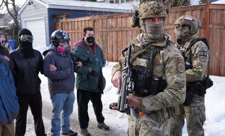 Border Patrol agents stand guard as protesters block a street after a driver of a vehicle was shot in Minneapolis on Jan. 7. (Tim Evans/Reuters)