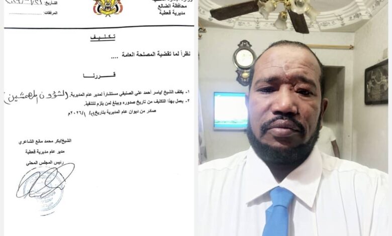 مدير عام مديرية قعطبة يكلف الشيخ ياسر الصنيفي مستشاراً لمدير عام المديرية لشؤون المهمشين