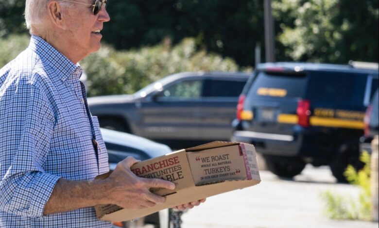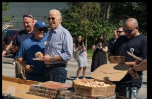 عندما نزل بايدن كان يمسك بصناديق من شطائر “كابريوتي”، وهي سلسلة مطاعم تأسست في ويلمنغتون، في مسقط رأسه في ولاية ديلاوير، في عام 1976، فيما كان عدد من أفراد الرابطة يشاركون في أعمال الإغاثة التي أعقبت الإعصار إيدا.