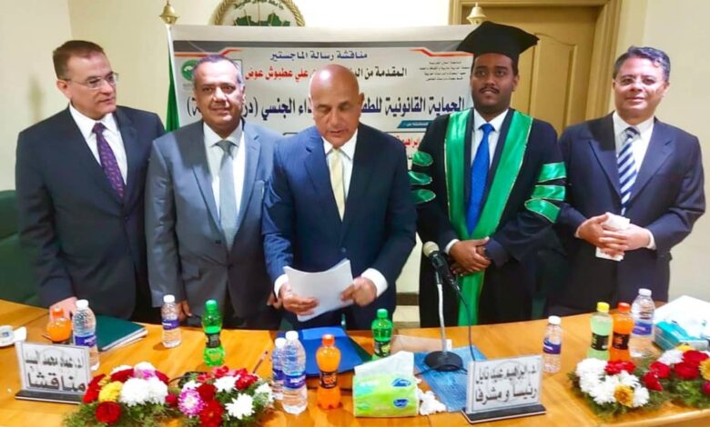 حصل الباحث القاضي صبري علي عطبوش عوض، الأربعاء، على درجة الماجستير في الحقوق بتقدير ممتاز، عن أطروحته العلمية الموسومة بـ «الحماية القانونية للطفل من الاعتداء الجنسي (دراسة مقارنة)»، وذلك من معهد البحوث والدراسات العربية بالقاهرة.