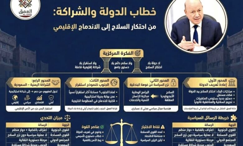 في تحليل حديث نشرته منصة العمق AL-OMQ تناولت المنصة التحولات العميقة في خطاب الدولة اليمنية مؤكدة أن بناء دولة فاعلة يرتبط باحتكار السلاح بيد المؤسسات ووجود دستور جامع يضمن الشراكة الوطنية ويؤسس لسلام مستدام يعالج جذور الصراع ويعزز فرص الاستقرار السياسي والاقتصادي في اليمن خلال المرحلة الانتقالية الراهنة بكل تعقيداتها وتحدياتها الأمنية والسياسية المتراكمة.