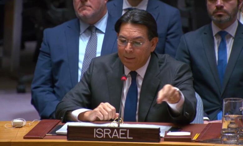 سفير اسرائيل الدائم لدى الأمم المتحدة في جلسة مجلس الأمن الدولي الطارئة اليوم السبت حول التصعيد الإسرائيلي الأمريكي الإيراني بلاده عملت مع الولايات المتحدة للتصدي لتهديد وجودي