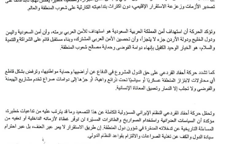 كما أكدت حركة حركة أحفاد القردعي، حق الدول المشروع في الدفاع عن أراضيها وحماية مواطنيها، ورفضها القاطع لأي محاولات لابتزاز المنطقة عسكريًا أو سياسيًا أو جرّها إلى صراعات تخدم مشاريع الهيمنة والفوضى، محمّلة إيران المسؤولية الكاملة عن هذا التصعيد وتداعياته المحتملة على الأمنين الإقليمي والدولي.