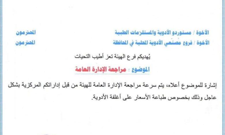 فرع الهيئة العليا للأدوية بــ«تعز» يدعو المستوردين ومصنّعي الأدوية لمراجعة الإدارة العامة في عدن