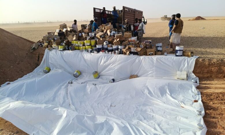 حضرموت : جمارك منفذ الوديعة تتلف بضائع منتهية وممنوعة بقيمة 46 مليون ريال