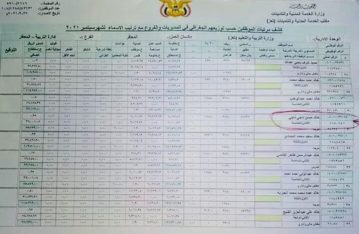 ومن ضمن القرارات، تعيين القيادي في حزب الإصلاح التربوي خالد حسن ناجي مديراً لشرطة مديرية المعافر، وقائداً للمنطقة الأمنية في المديرية، وفقاً لوثيقة مسربة تضمنت كشف الراتب وفيه اسم المدرس المعين قائداً لأمن المعافر.