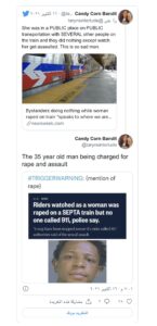 وقال بيرنهاردت: إن مراجعة لقطات المراقبة من قطار هيئة النقل بجنوب شرق بنسلفانيا (سيبتا) أثبت الواقعة، حيث ظهر في اللقطات رجل استقل القطار وبعد فترة وجيزة اقتب من امرأة، وجلس بجانبها ثم تبادل أطراف الحديث معها، و”تدريجيا” أصبح عدوانيًا، وفي النهاية مزق ملابسها واعتدى عليها جنسيًا.