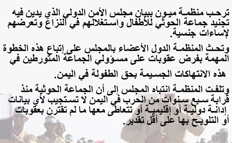 رحبت منظمة ميون لحقوق الإنسان بما ورد في بيان مجلس الأمن الدولي الصادر اليوم الأربعاء الذي يدين فيه تجنيد الحوثيين للأطفال واستغلالهم في النزاع وتعرضهم لإساءات جنسية.