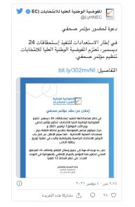 ودعت المفوضية، جميع وسائل الإعلام ومنظمات المجتمع المدني لحضور هذا المؤتمر بالمركز الإعلامي بالمفوضية في الموعد المحدد على تمام الساعة 12 ظهرا.