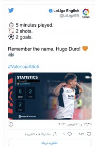 لفريق “الروخي بلانكوس” بنتيجة 3-1، كان لنجم فالنسيا الواعد هوغو دورو البالغ 21 عاما رأي آخر، حيث لعب دور المنقذ فور نزوله إلى أرض الملعب في الوقت بدل الضائع وسجل خلال 5 دقائق هدفين ليجبر أتلتيكو على التعادل، وسط فرحة عارمة من الجماهير التي ملأت مدرجات ملعب “الميستايا” معقل “الخفافيش”.