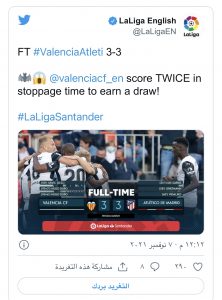 فرض فالنسيا التعادل في الوقت القاتل على ضيفه أتلتيكو مدريد بنتيجة 3-3 في المباراة التي جمعتهما اليوم الأحد ضمن منافسات الجولة الـ13 من الدوري الإسباني لكرة القدم “الليغا”.