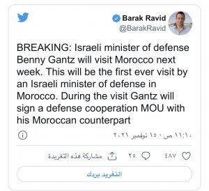 يذكر أن وزير الدفاع الإسرائيلي بيني غانتس سيتوجه يوم 24 نوفمبر إلى الرباط، في زيارة هي الأولى من نوعها لوزير دفاع إسرائيلي إلى المغرب ستمتد إلى يومين، وسيوقع خلالها اتفاقية تفاهم تحدد شروط التعاون في مجال الدفاع.
