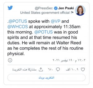 وأكدت بساكي في تدوينتها أن بايدن “كان في حالة معنوية جيدة”.