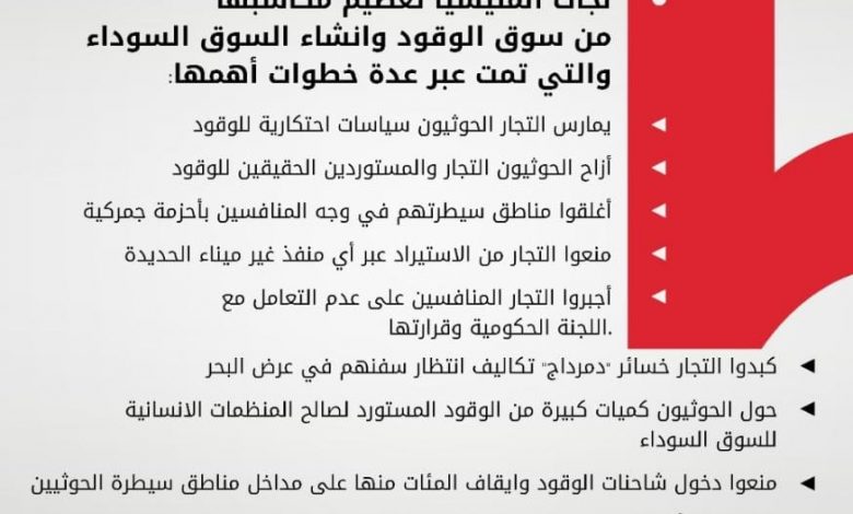 إلى تعظيم مكاسبهم من سوق الوقود وانشأت السوق السوداء بعد تهميش الجماعة دور شركة النفط، واحتكار السوق لصالحها فقط، وتهميش التجار الحقيقيين، وإغلاق وجه مناطق سيطرتهم في وجه المنافسين من خلال احزمة جمركية، ومنع الاستيراد من أي منفذ بخلاف ميناء الحديدة، مما أدى إلى افتعال أزمات وقود متكررة، وتكبيد التجار خسائر “دمرداج” تكاليف انتظار سفنهم في البحار.