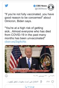 وتوجه بايدن إلى الأمريكيين محذرا: “إذا لم تكن ملقحا بالكامل ضد كورونا، فلديك سبب وجيه للقلق بشأن متحور أوميكرون.. أنت في خطر كبير للإصابة بالمرض”، مضيفا: “تقريبا كل من مات من كوفيد-19 في الأشهر الماضية لم يتم تطعيمه”.