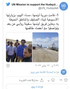 وقالت البعثة الأممية لدعم اتفاق الحديدة، في بيان نشرته عبر حسابها على “تويتر”: “قامت دورية “أونمها”، مساء اليوم، بزيارتها الأسبوعية لميناء الصليف والمناطق المحيطة به، وعاين فريق أونمها سفينة روابي عن بعد وتواصلوا مع أعضاء طاقمها”.