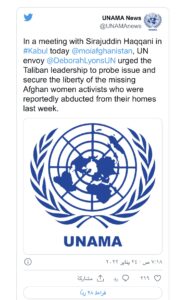 وأخبرت بعثة الأمم المتحدة للمساعدة في أفغانستان (أوناما) عبر صفحتها على “تويتر” أن رئيسة البعثة ديبورا لايونز التقت في كابل اليوم الاثنين سراج الدين حقاني، وزير الداخلية في الحكومة المنبثقة عن “طالبان” (وغير المعترف بها دوليا)، لمناقشة موضوع اعتقال الناشطتين.