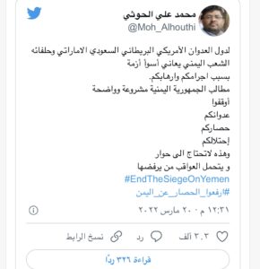 ولفت الحوثي في تغريده له على منصة “تويتر” مساء اليوم الأحد ، إلى أن مطالب الجمهورية اليمنية مشروعة وواضحة.