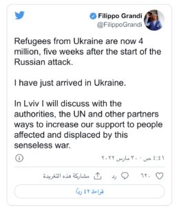 وفي تغريدة عبر “تويتر”، قال فيليبو غراندي، مفوض الأمم المتحدة السامي لشؤون اللاجئين: “وصل عدد اللاجئين من أوكرانيا الآن إلى 4 ملايين، بعد خمسة أسابيع من بدء العملية العسكرية الروسية”.